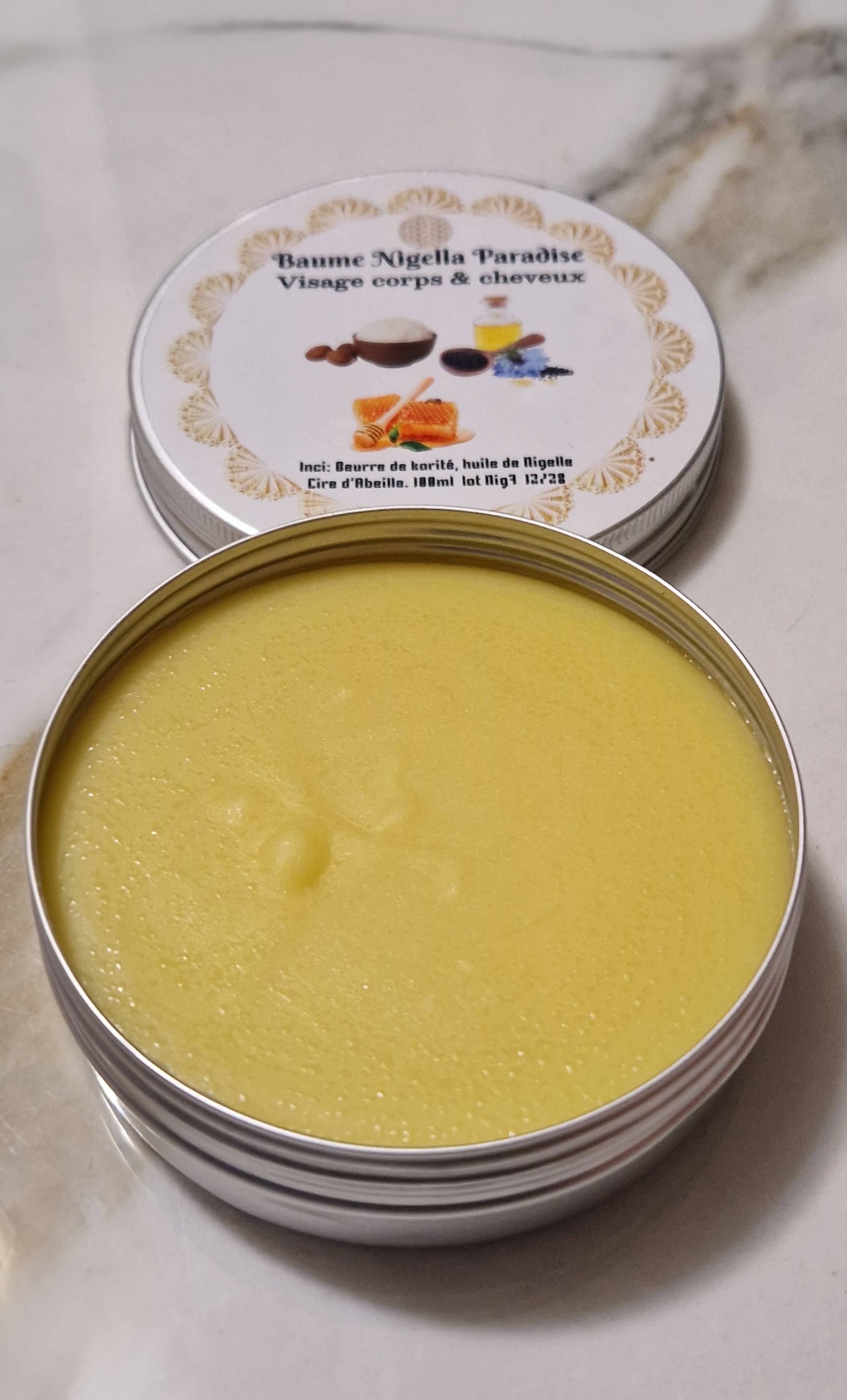 Notre baume Nigella Paradise est un baume universel qui vous offrira un soin complet pour nourrir et hydrater votre peau ainsi que vos cheveux.