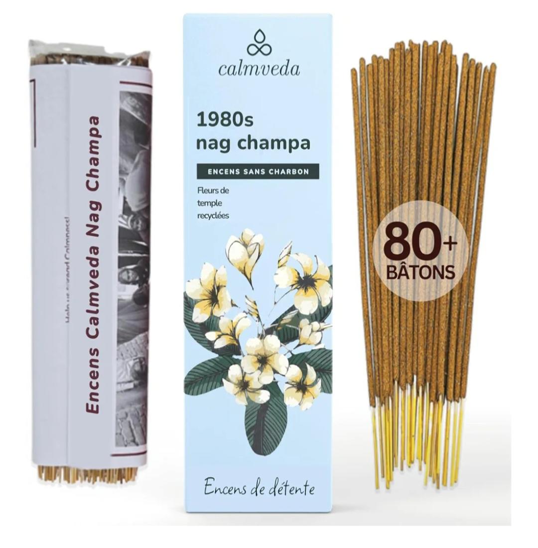 Se révélant comme le mélange d'encens le plus réussi commercialement au monde, le Nag Champa est issu d'une recette secrète avec cette odeur unique qui est essentiellement produite par une combinaison de fleur de Nag Champa, Frangipanier, de bois de santal, avec parfois l'ajout de résine de l'arbre Alianthus Malabarica, devenu un encens floral intemporel très apprécié dans le monde entier.
