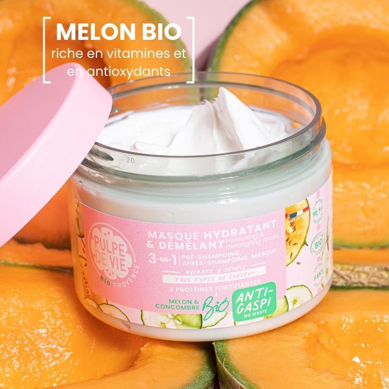 • Cucumis Melo (Melon) Fruit Water : Eau de melon BIO, participe à l’hydratation et la régénération de la chevelure.