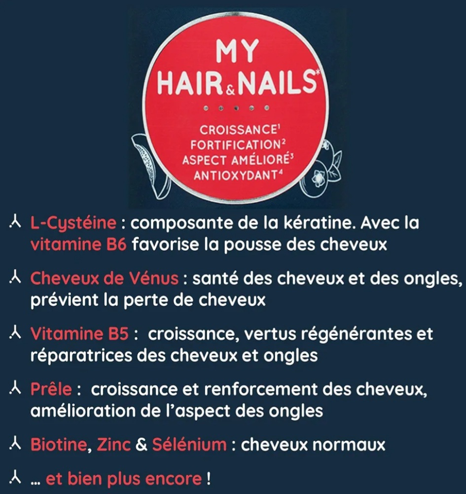 Les bienfaits sont tellement nombreux : renforcement de la santé des cheveux et des ongles, croissance des cheveux et des ongles, du volume, de la brillance, ralentissement de la chute et de l’apparition des cheveux blancs, des ongles forts…
