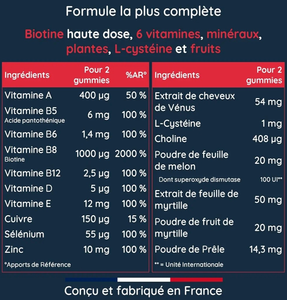 • 7 vitamines dont la Biotine et B12 … et bien plus encore !