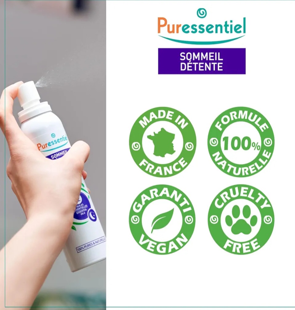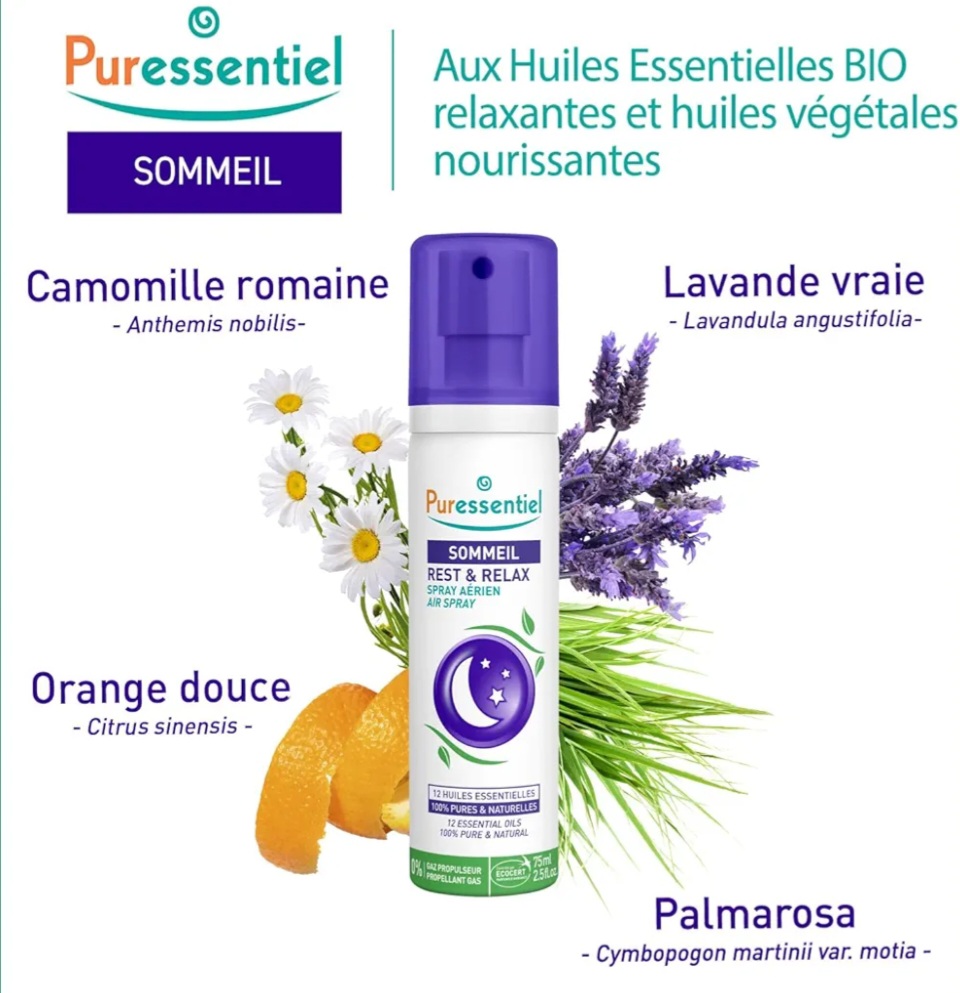 Le Spray Aérien Sommeil, enrichi d'une synergie de 12 huiles essentielles dont la Lavande Vraie, la Camomille Romaine et l'Orange Douce, est une solution qui facilite l'endormissement.
